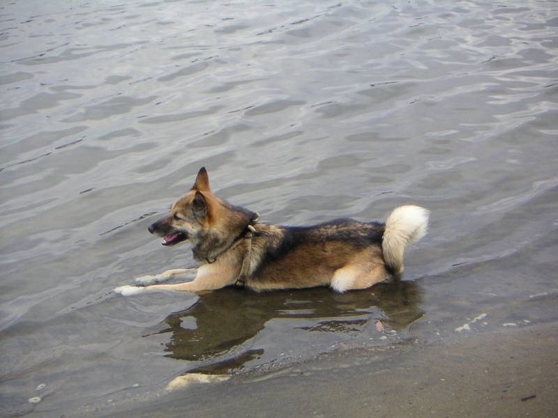 秘密の河原を散策するきゃらの図。この後、魚の骨を見つけて食べちゃいました。(汗)