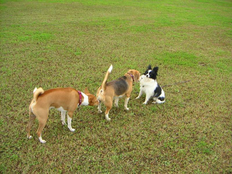 新顔のクーさんに挨拶するきゃらの図。クーさんはおフランス製のワンちゃんとのことです。 |