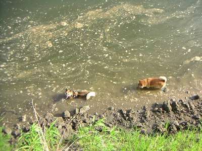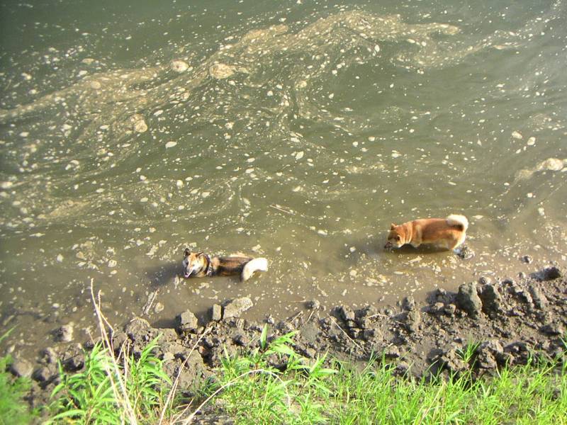 毎度おなじみ、カイ君の水浴び。でも今日の川はちょっと汚くない?
