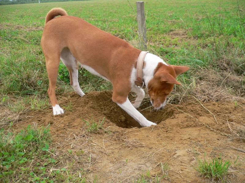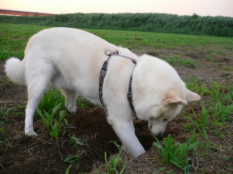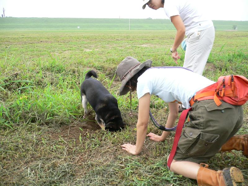 ネズミ穴の掘れ具合をチェックするマル姐さん |