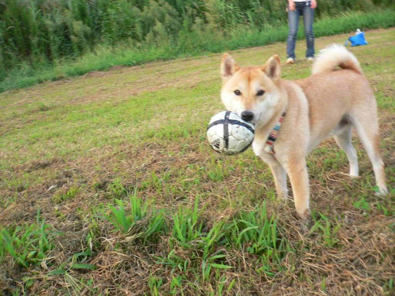 忘れ物のボールをくわえてご満悦の