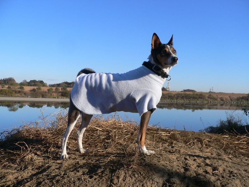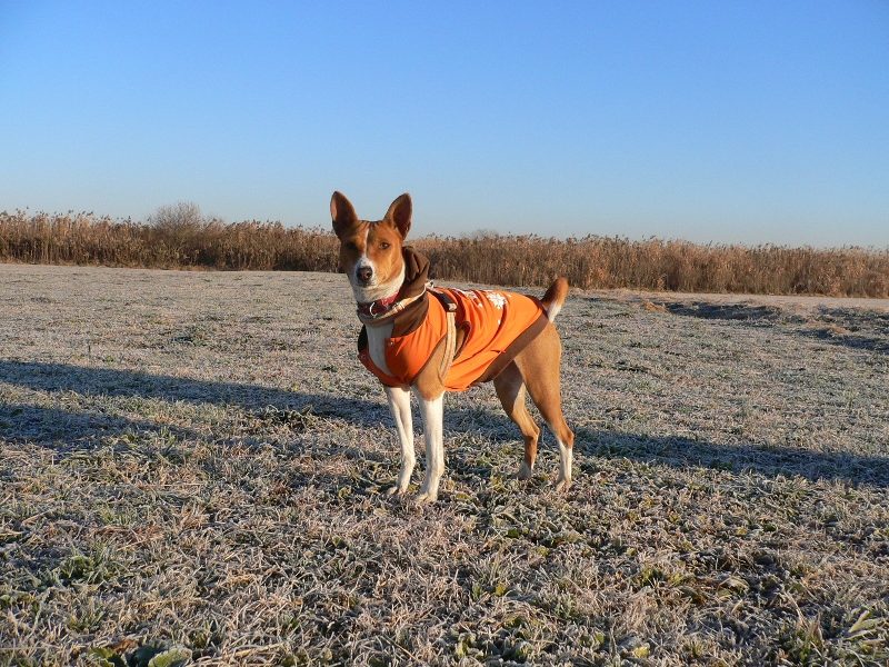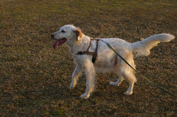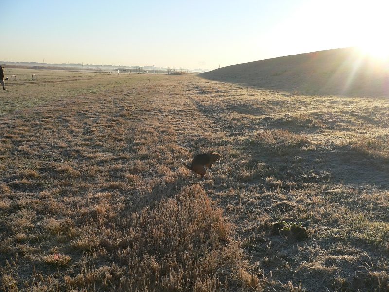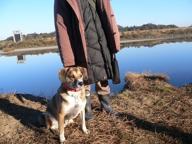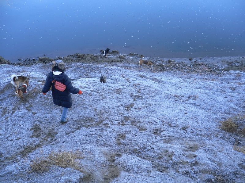 今日の川原は霜で真っ白け。でもリリーさんは暖かそう。 |