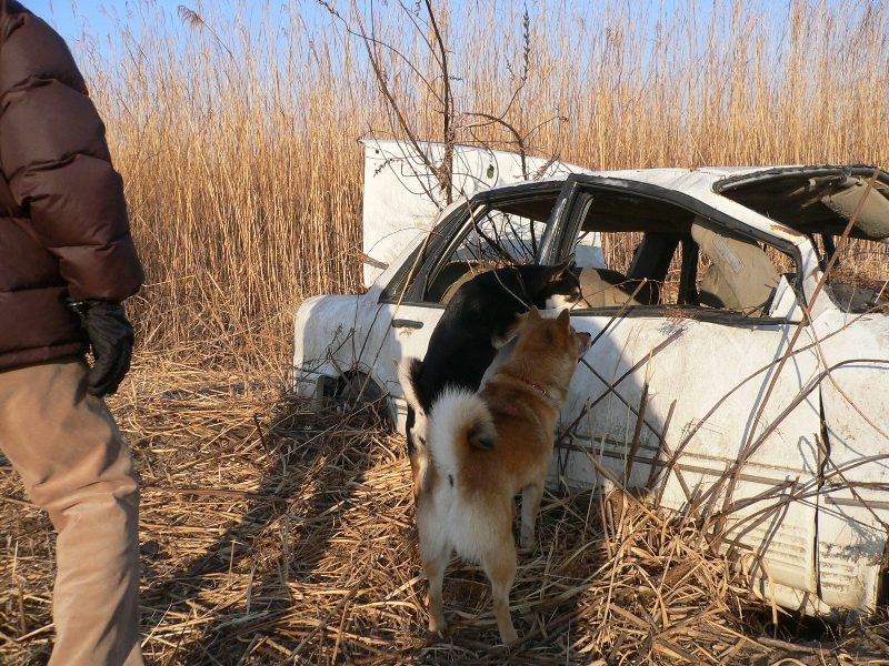 川岸の奥地に怪しい廃車を発見!調査するマルとジョン君。 |