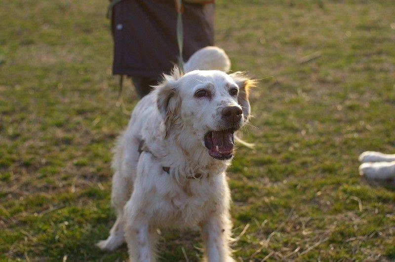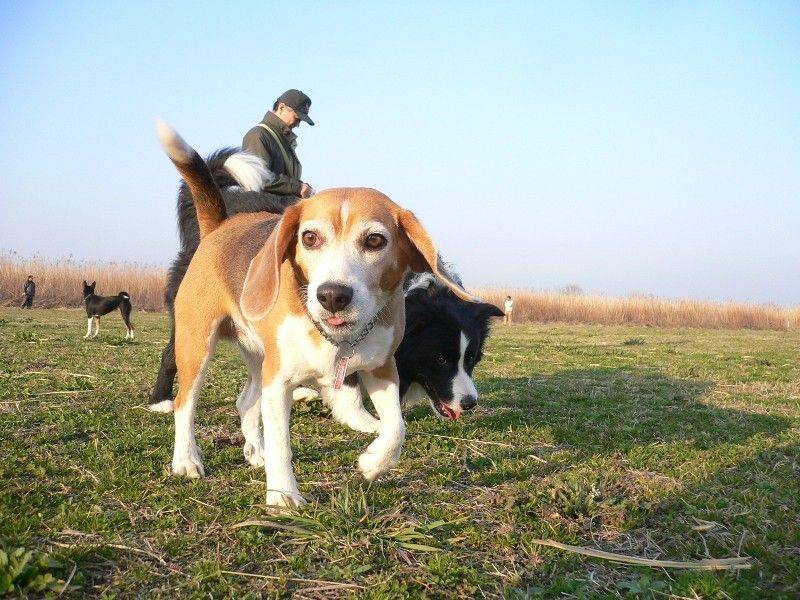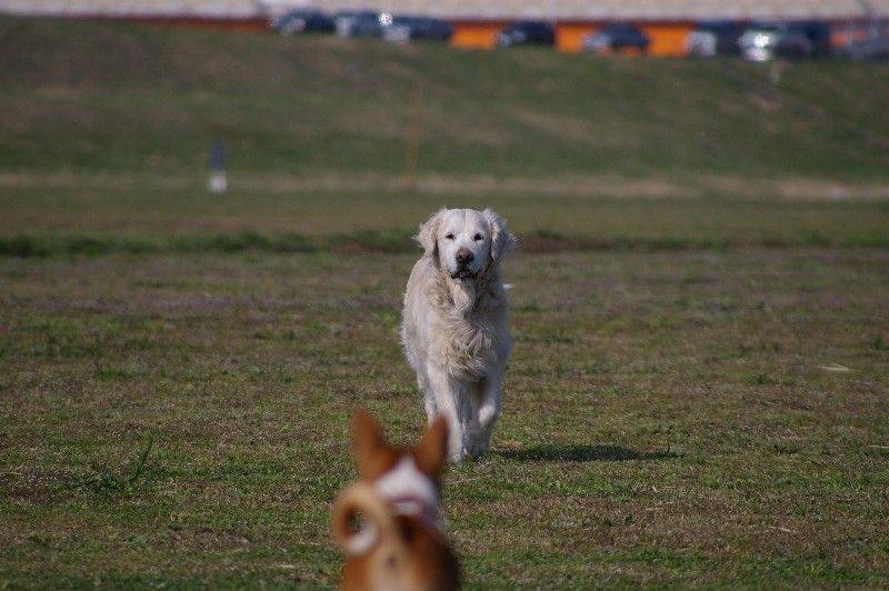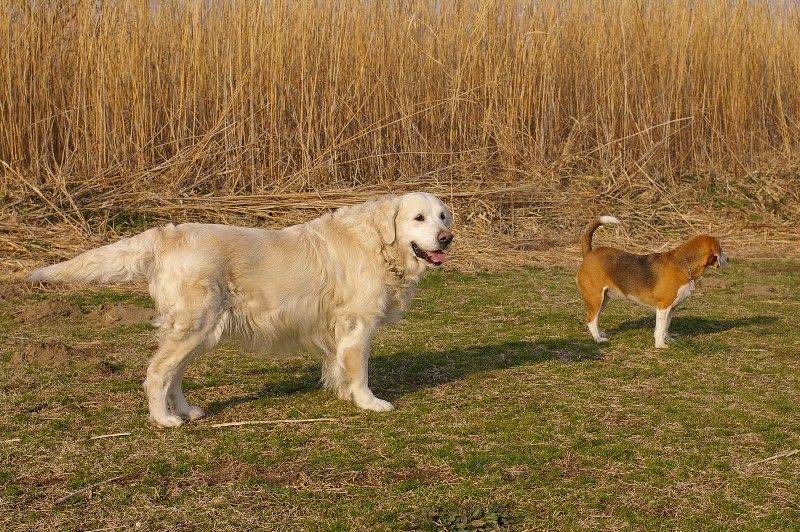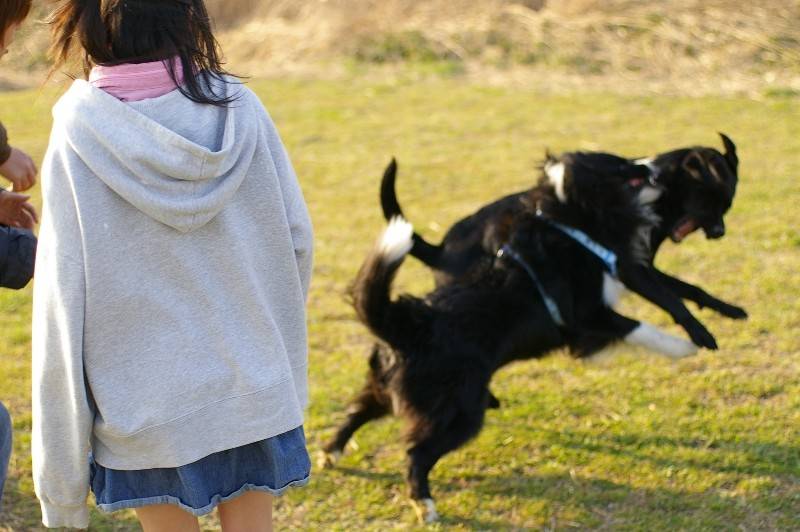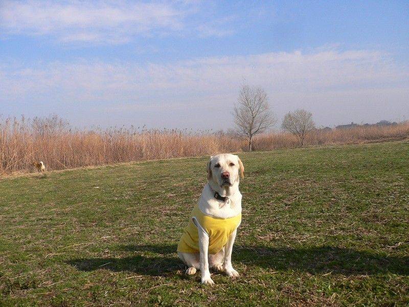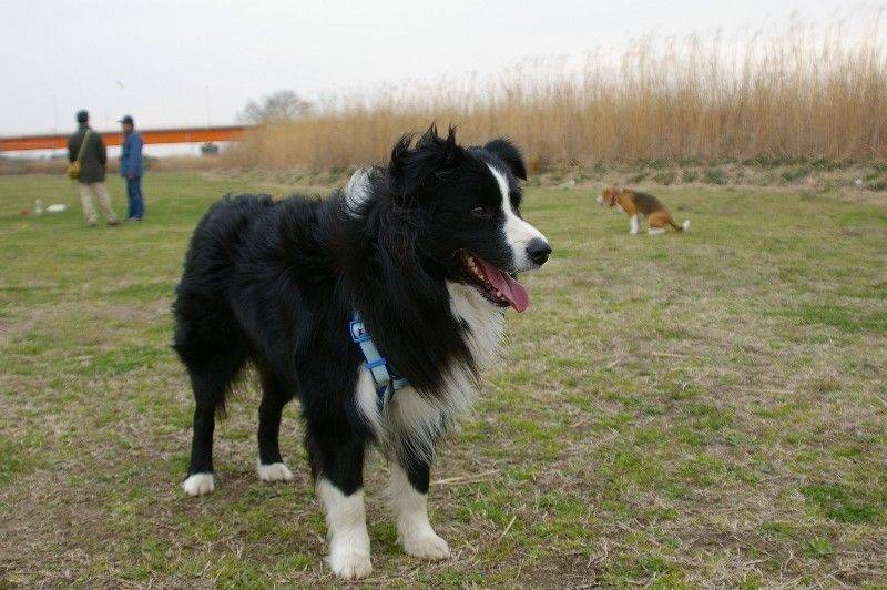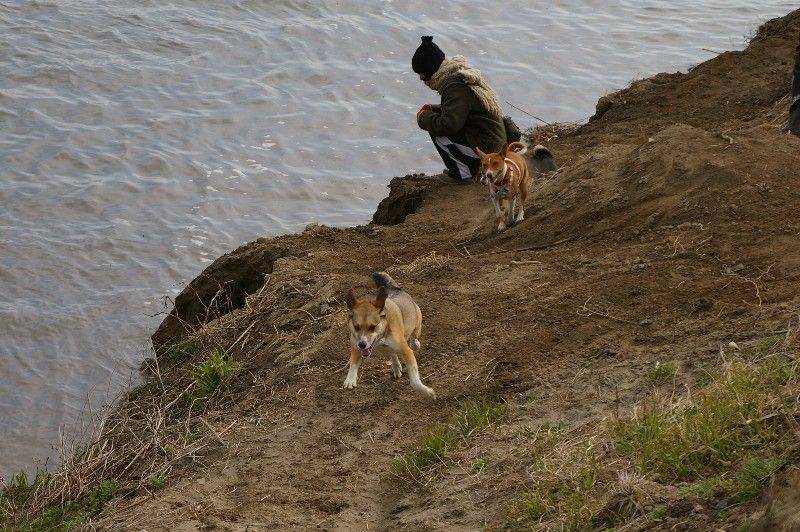 川岸を走り回る大吉君とリリーさん。 |