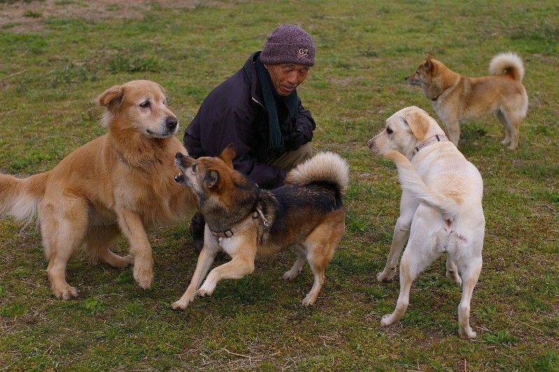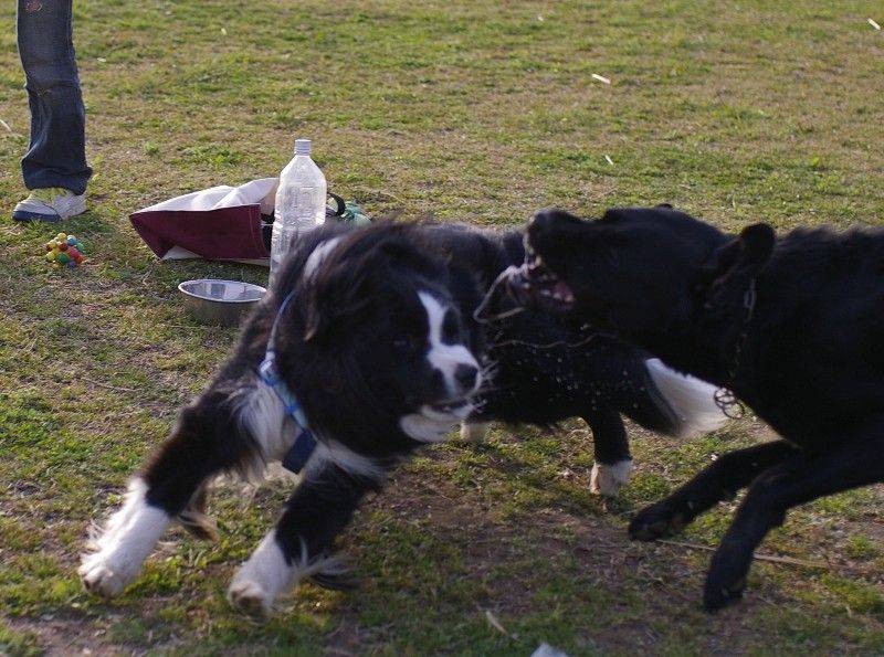 こちらはじゃれあい。コラル君(左)とバロン君(中)。カメラ目線はイッコさん(右)。 |