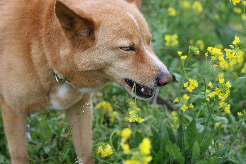 菜の花を味わうアルクさん。「春だねぇ〜」。 |
