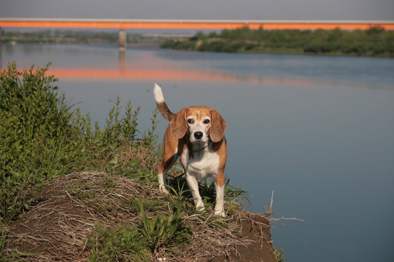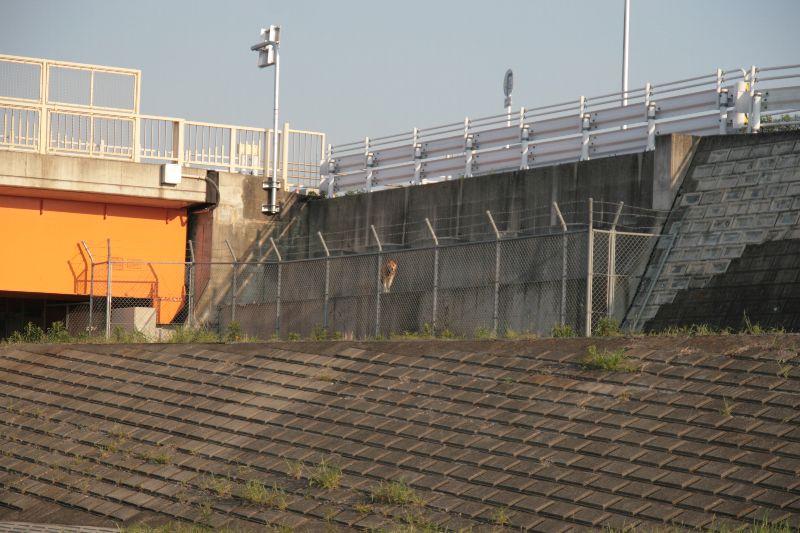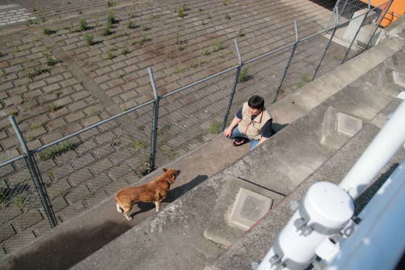朝河原に行ってみると柵の中に謎犬が? |