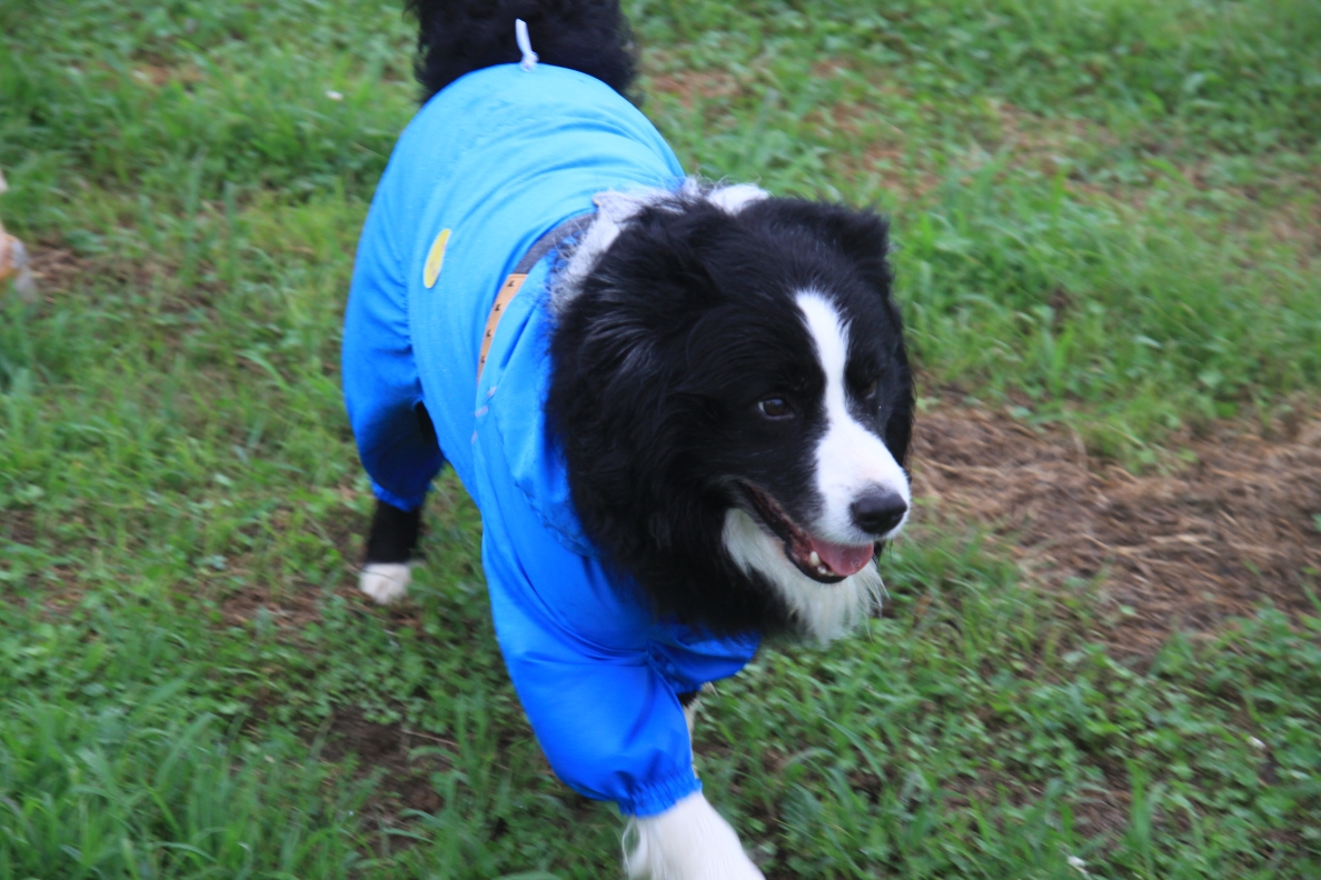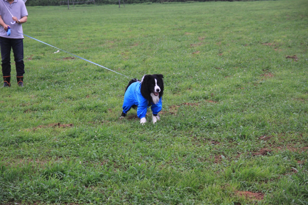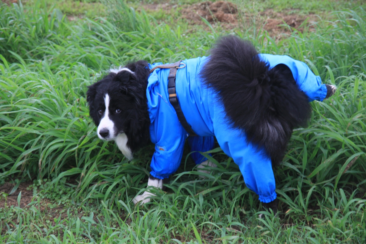 かわいい水玉模様の合羽を着て登場のへなちょこ僕ちゃん。 |