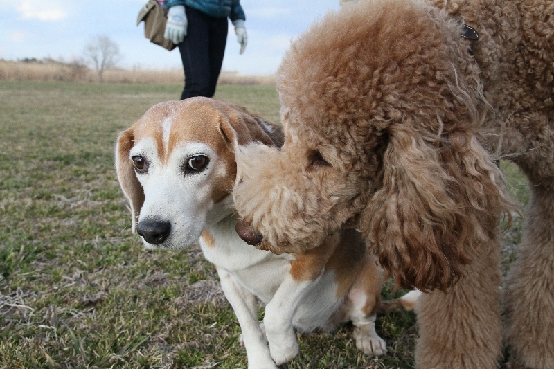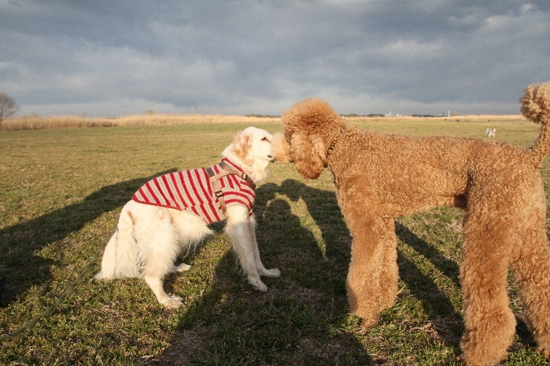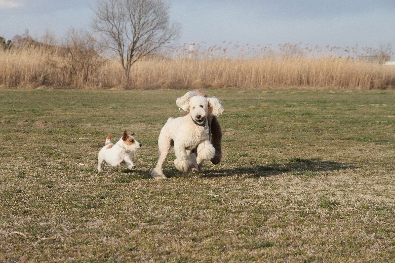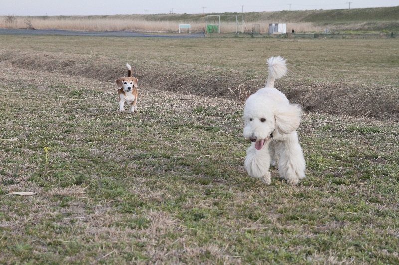 巨大プードルさんと走るニコちゃんの図。 |