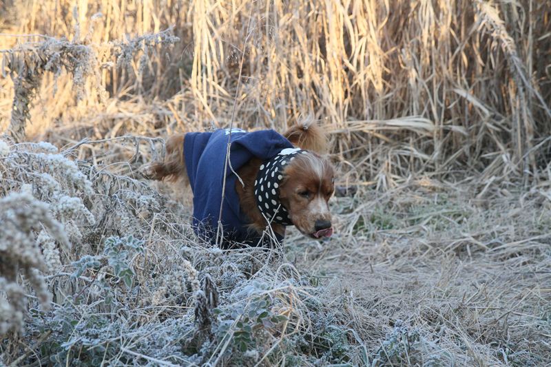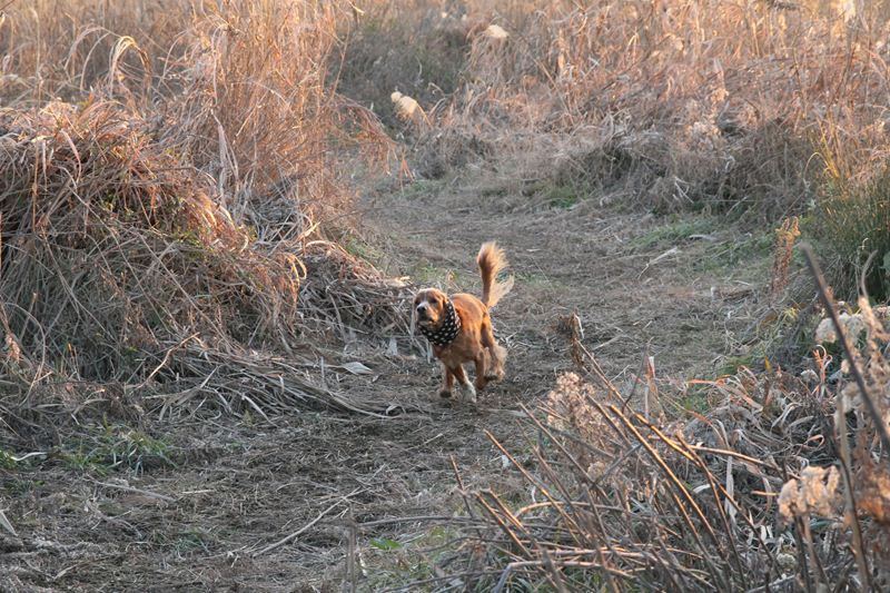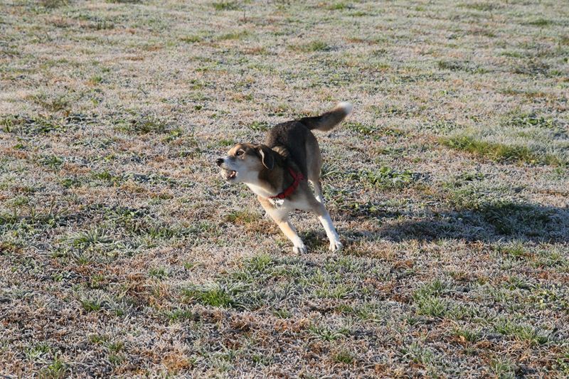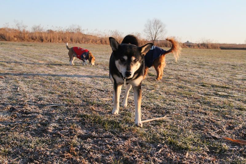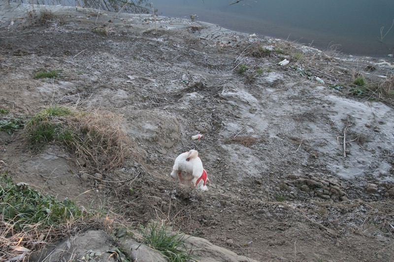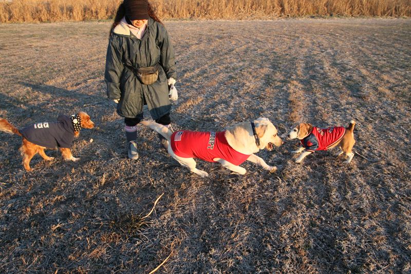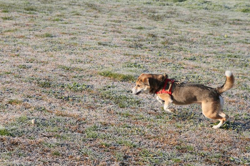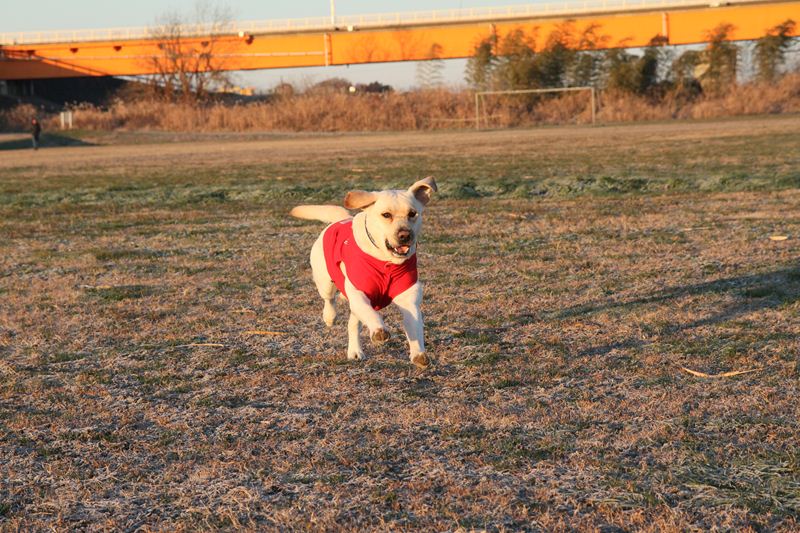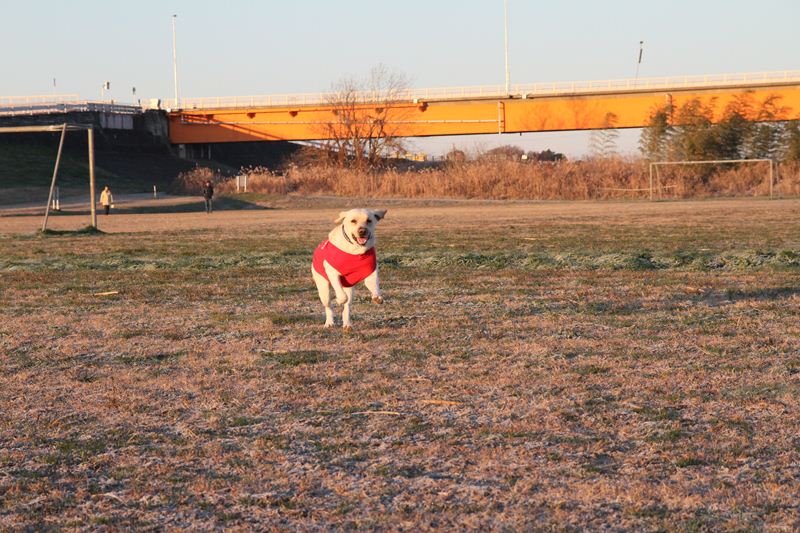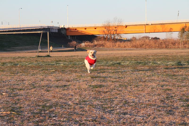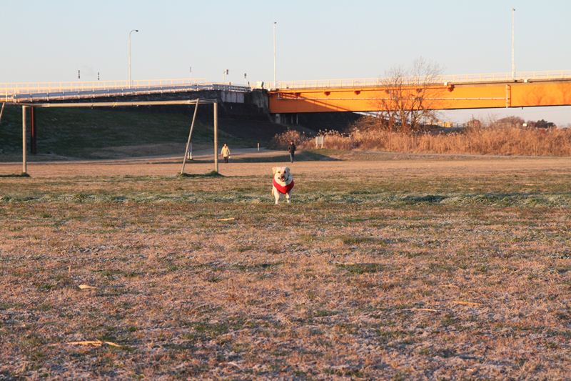 凍てついた川原をぎこちなく走るきゃらの図。 |