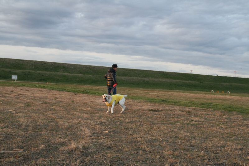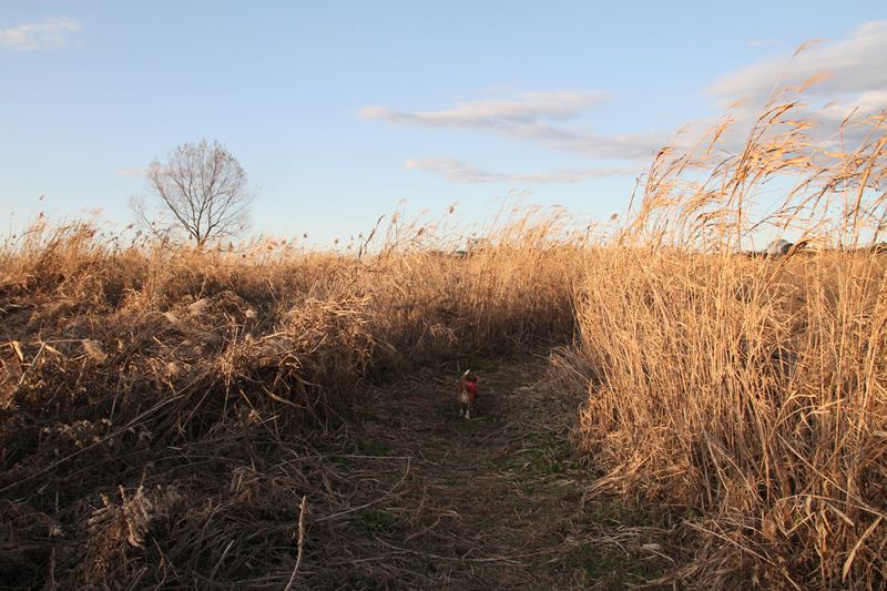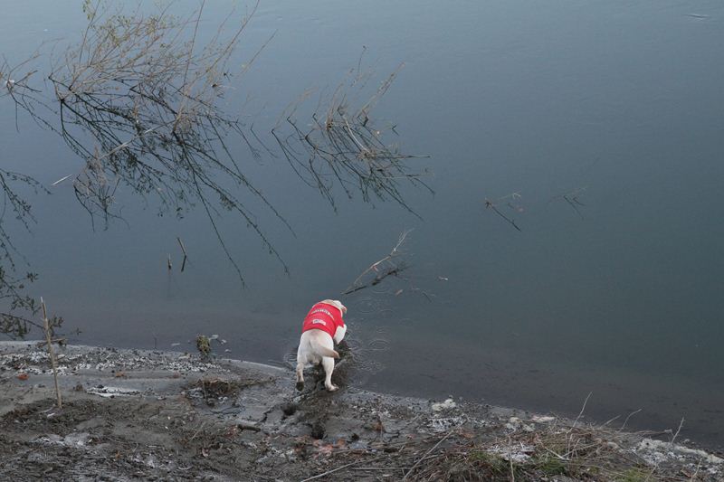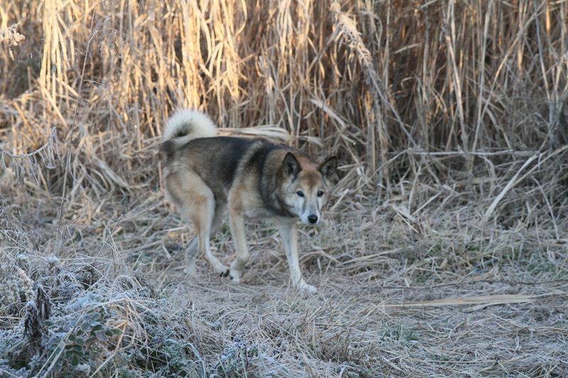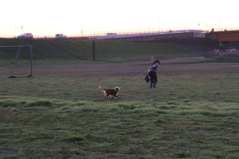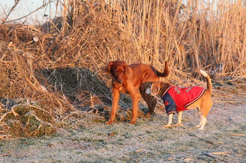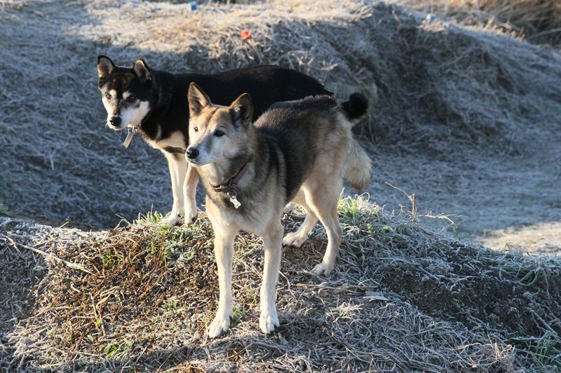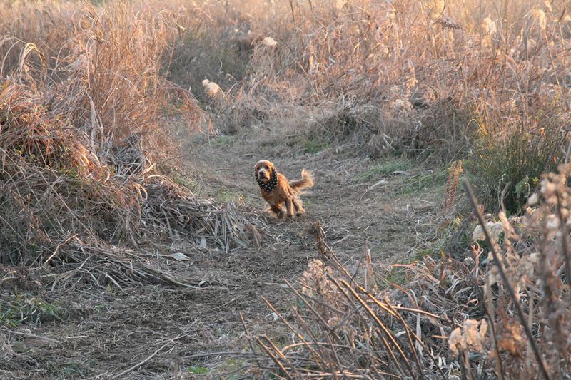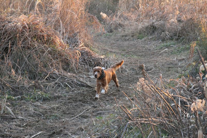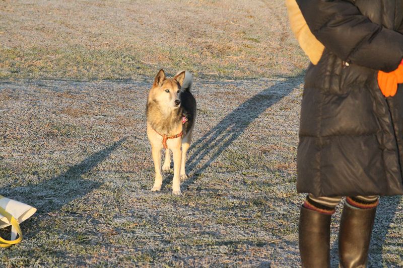 凍てついた川原をぎこちなく走るきゃらの図。 |