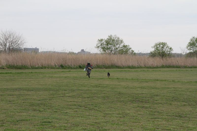 ねずみ堀りに戻る黒い人を追いかけるマル姉さん。 |