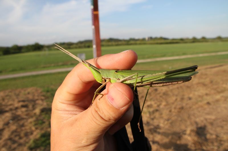 捕まえたバッタをどうするかって?もちろん食べるのさっ!踊り食い。 |