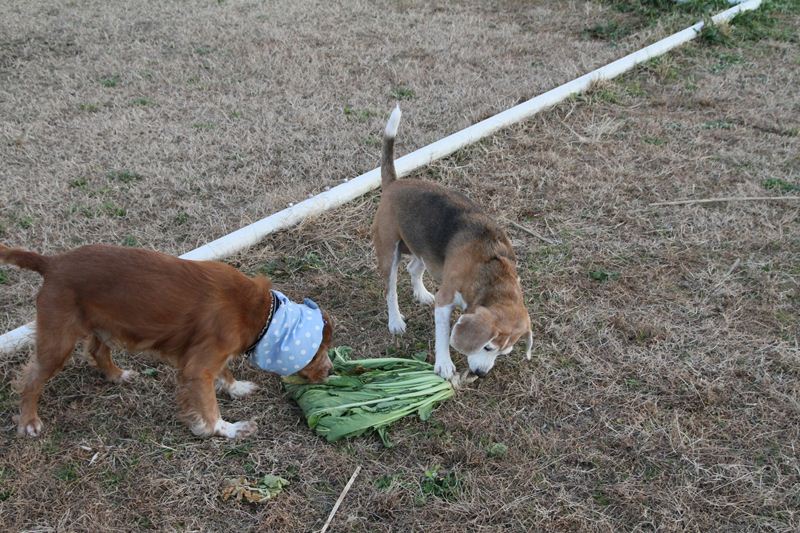 菜っ葉を食べる二人。 |