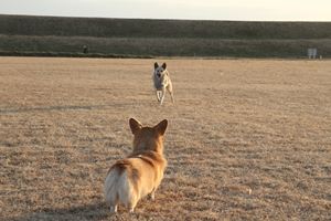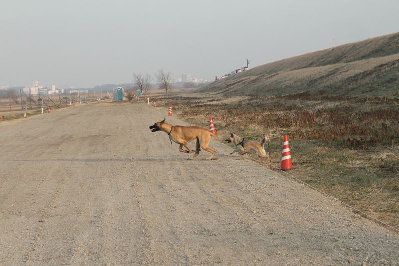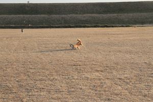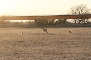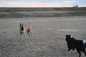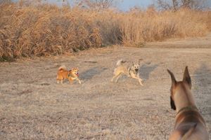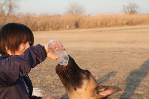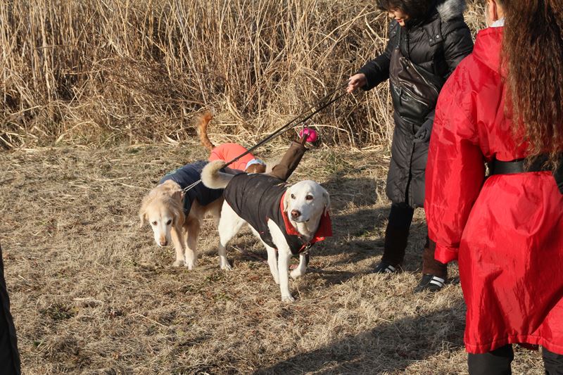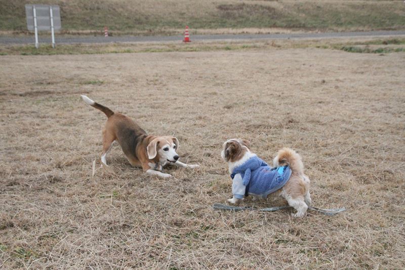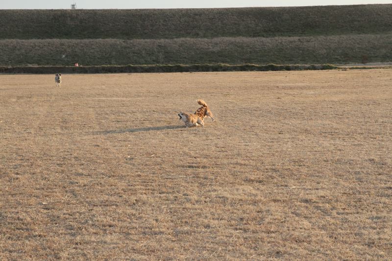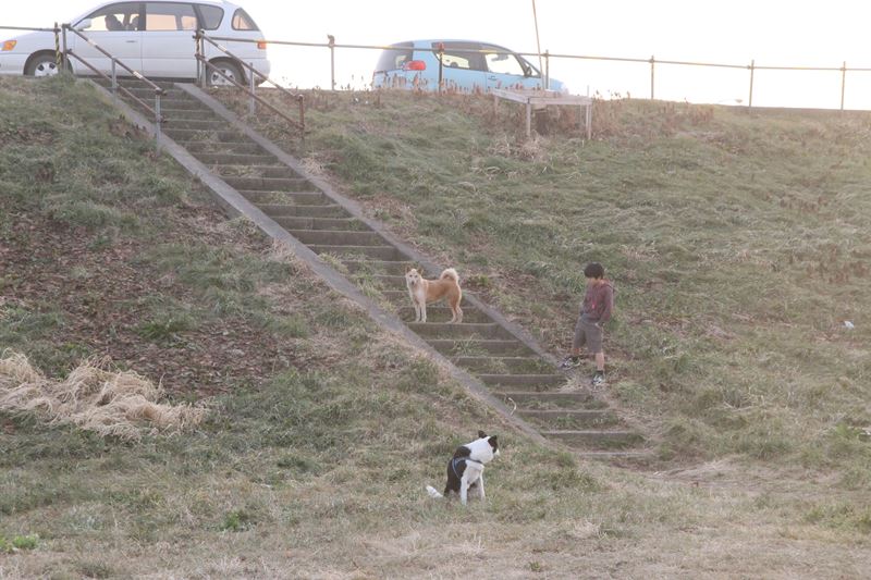 2月17日 河原を楽しむバジル君を見る二人。 |
